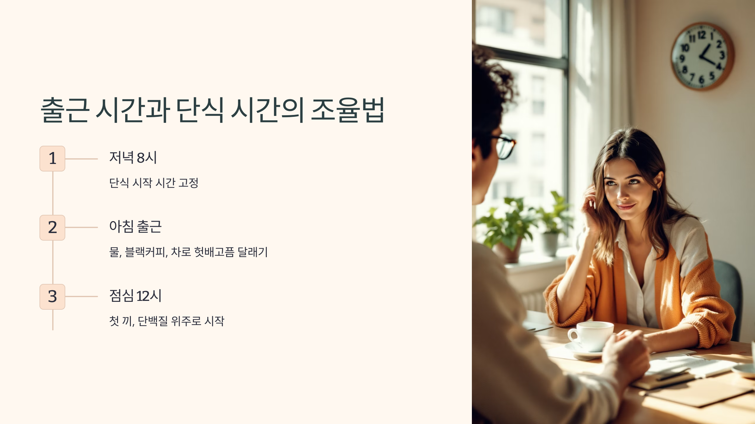 출근 시간과 단식 시간, 처음엔 좀 엇박자 날 수 있어요. 하지만 단식 시작 시간을 저녁 8시로 고정하면 자연스럽게 점심 12시부터 식사를 시작하게 됩니다. 중요한 건, 첫 끼를 너무 폭식하지 않는 것이에요. 공복을 오래 유지했기 때문에 단백질 위주의 부드러운 음식부터 시작해야 위장에도 무리가 가지 않아요. 출근 전에 헛배고픔이 심할 땐 물, 블랙커피, 따뜻한 차로 배를 달래주면 효과적이에요.