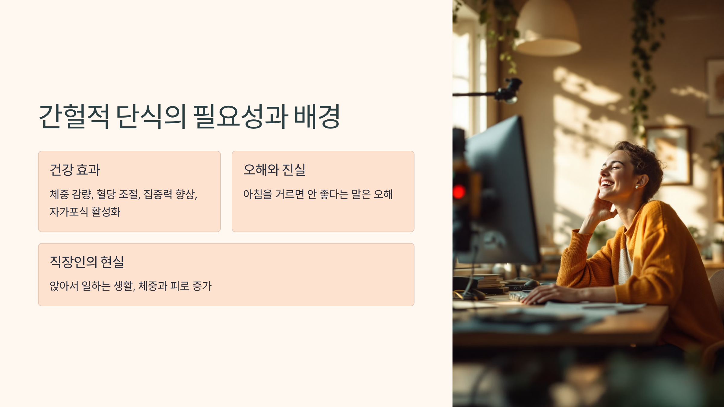 ‘아침을 거르면 건강에 안 좋다’는 말, 정말일까요? 요즘은 오히려 공복 상태가 건강을 개선한다는 연구들이 많아졌어요. 특히 간헐적 단식(Intermittent Fasting)은 체중 감량은 물론, 혈당 조절, 집중력 향상, 자가포식 활성화 등 다양한 건강 효과가 검증되었죠. 저도 평범한 사무직으로, 하루 종일 앉아서 일만 하니 체중과 피로가 쌓여만 갔는데요. 무작정 굶는 게 아니라 시간을 정해두고 식사하는 방식은 생각보다 덜 힘들고, 오히려 생활이 간결해졌답니다. 😊