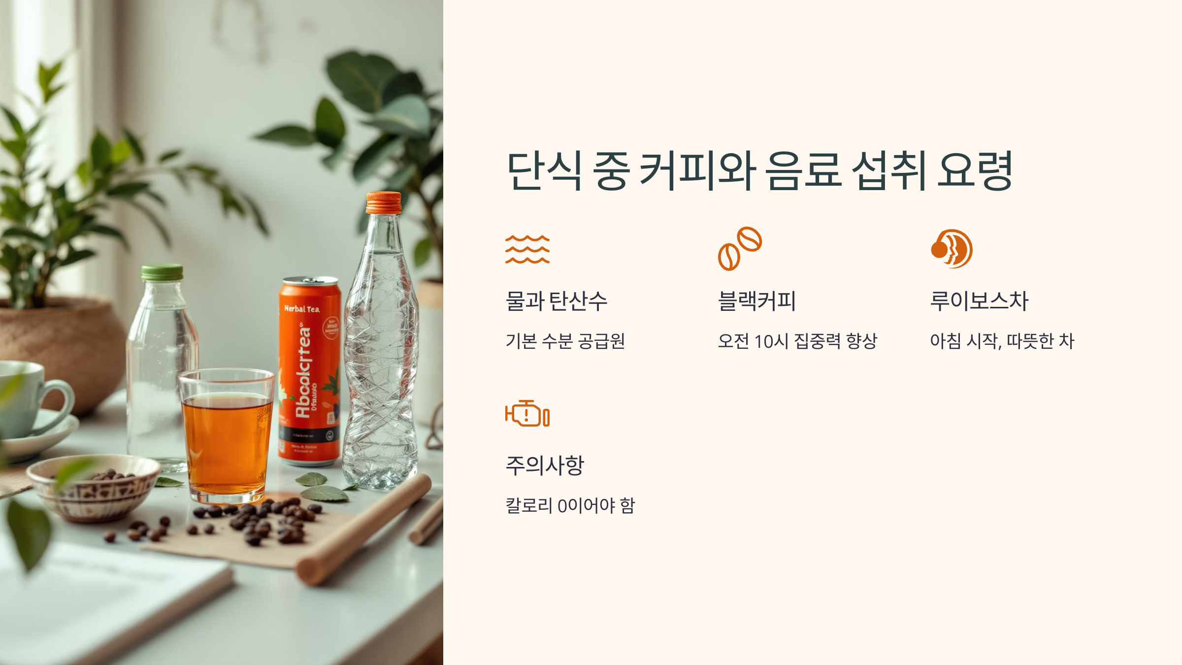 공복 중에도 마실 수 있는 음료가 있어요. 대표적으로는 물, 탄산수, 블랙커피, 허브티가 있어요. 단, 주의할 점은 칼로리 0이어야 한다는 것! 저는 아침마다 따뜻한 루이보스차로 시작해서, 오전 10시쯤엔 블랙커피 한 잔으로 집중력을 끌어올려요. 단식 중에 설탕이나 프림이 들어간 음료는 금물이에요. 이 작은 실수 하나로 인슐린 반응이 발생해서 단식 효과가 무력화될 수 있거든요!