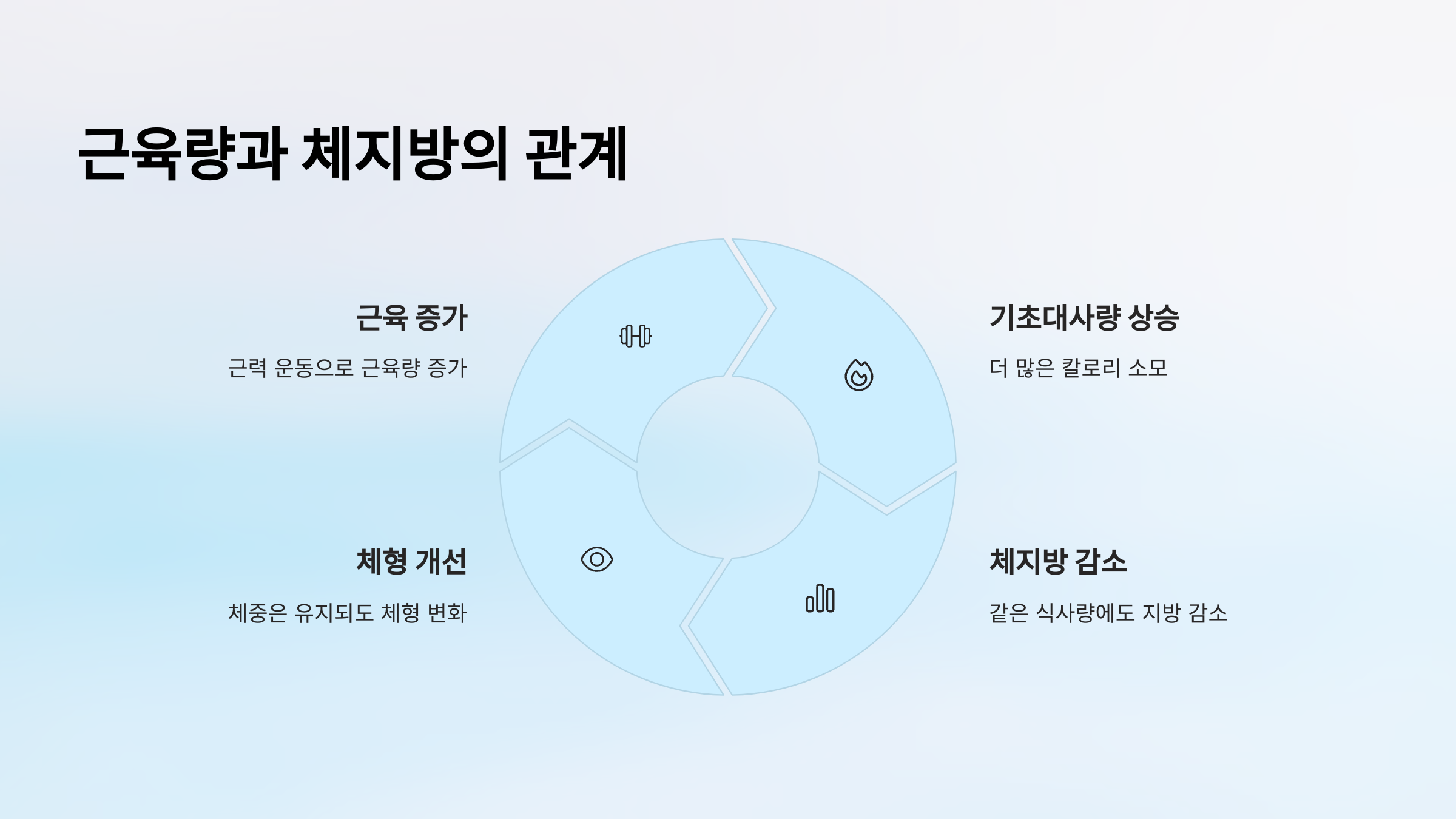 근육이 많아질수록 기초대사량이 올라가서, 동일한 음식 섭취에도 체지방이 더 잘 빠집니다.